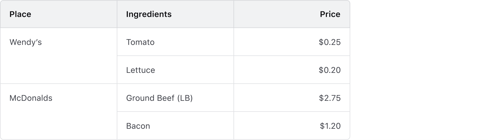 For the user to scan, sort, and filter the table easily, each cell should contain a single piece of data. Having more than one piece of data in a cell makes it harder for users to navigate the relationships between headers and cells.